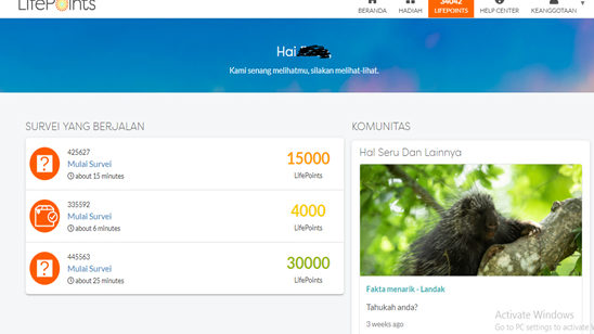 LifePoints merupakan situs web yang memberikan pertanyaan survey cukup banyak dengan imbalan poin yang lumayan besar pula, mulai dari 4000 hingga 30000 poin persurvey nya tergantung kesulitan dalam menjawab survey. Namun sayangnya poin dalam survey ini tidak dapat ditukar dengan dolar, melainkan dengan voucher belanja seperti hypermart, MAP, Carrefour, ZALORA, dan lain-lain.