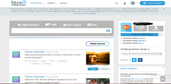 Toluna Influencers merupakan situs web yang menyediakan survey sama halnya dengan situs-situs lainnya namun toluna ini cukup sering menyediakan pertanyaan untuk survey dan poin yang didapatkan cukup lumayan dari 100 hingga 3000 poin persurvey nya. Poin ini dapat ditukarkan melalui paypal dengan batas minimal poin 10200=Rp 20.000 , dan voucher belanja seperti Alfamart, Indomart, blibli.com, tokopedia, Bukalapak, AirAsia, dan pulsa isi ulang dengan batas minimal 12875 poin.